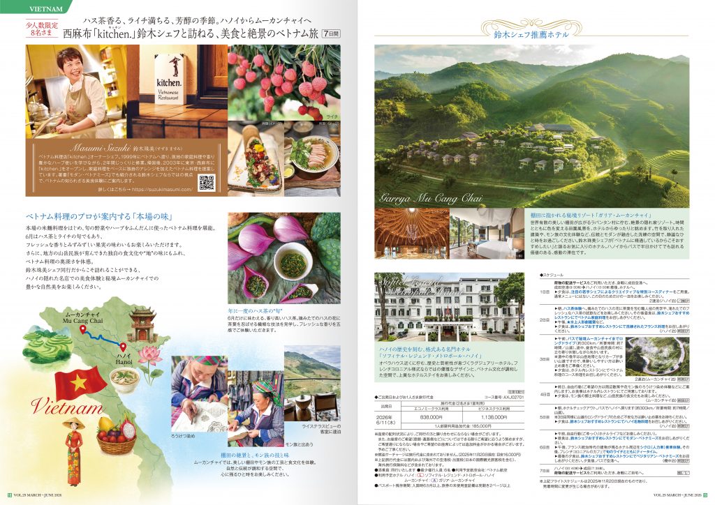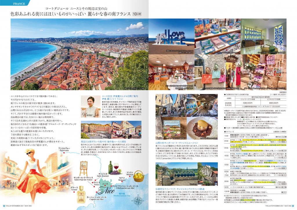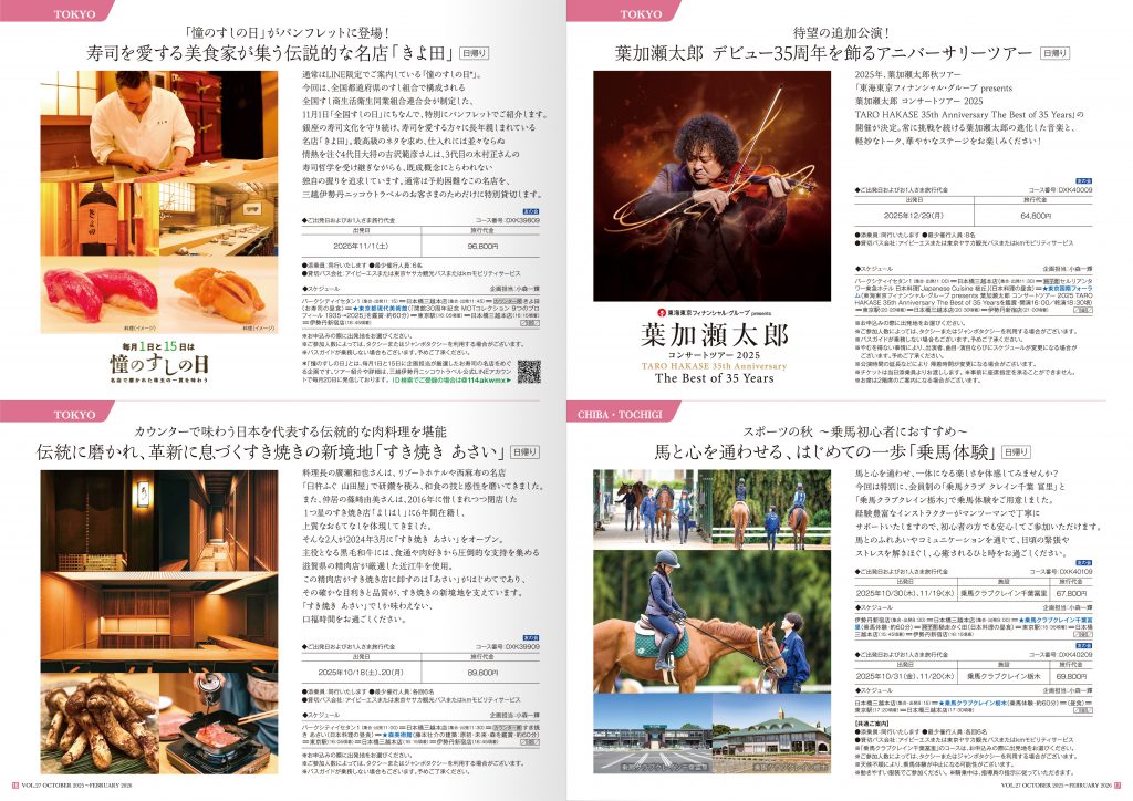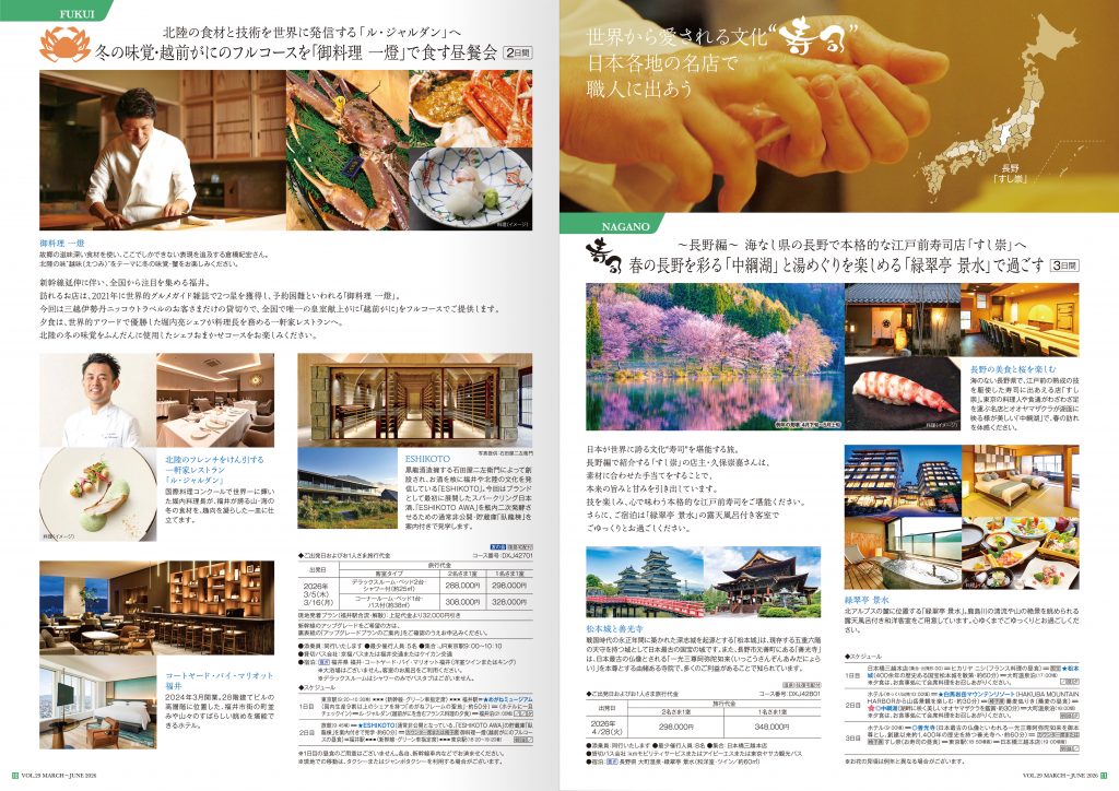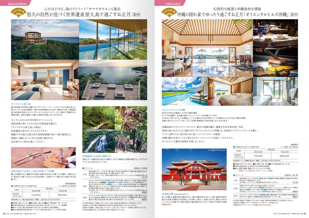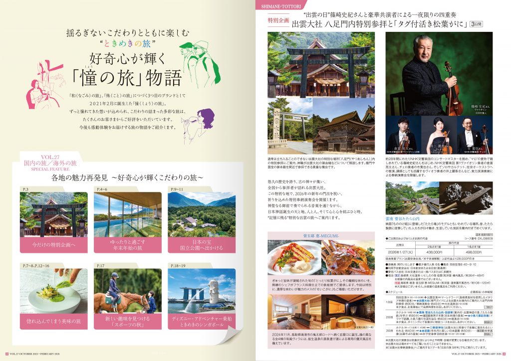 ミドル世代向けパッケージ旅行「憧(しょう)の旅」では、多くの情報をわかりやすく紹介するため、シンプルなデザイン構成に仕立ています。個人向けオーダーメイド旅行「唯(ゆい)の旅」では、毎回取材を通しツアー企画担当者のこだわりなどをエディトリアル風にまとめ、読者が興味を持つパンフレットに仕立てています。
